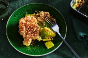 Preischotel met kerrie en amandelcrunch