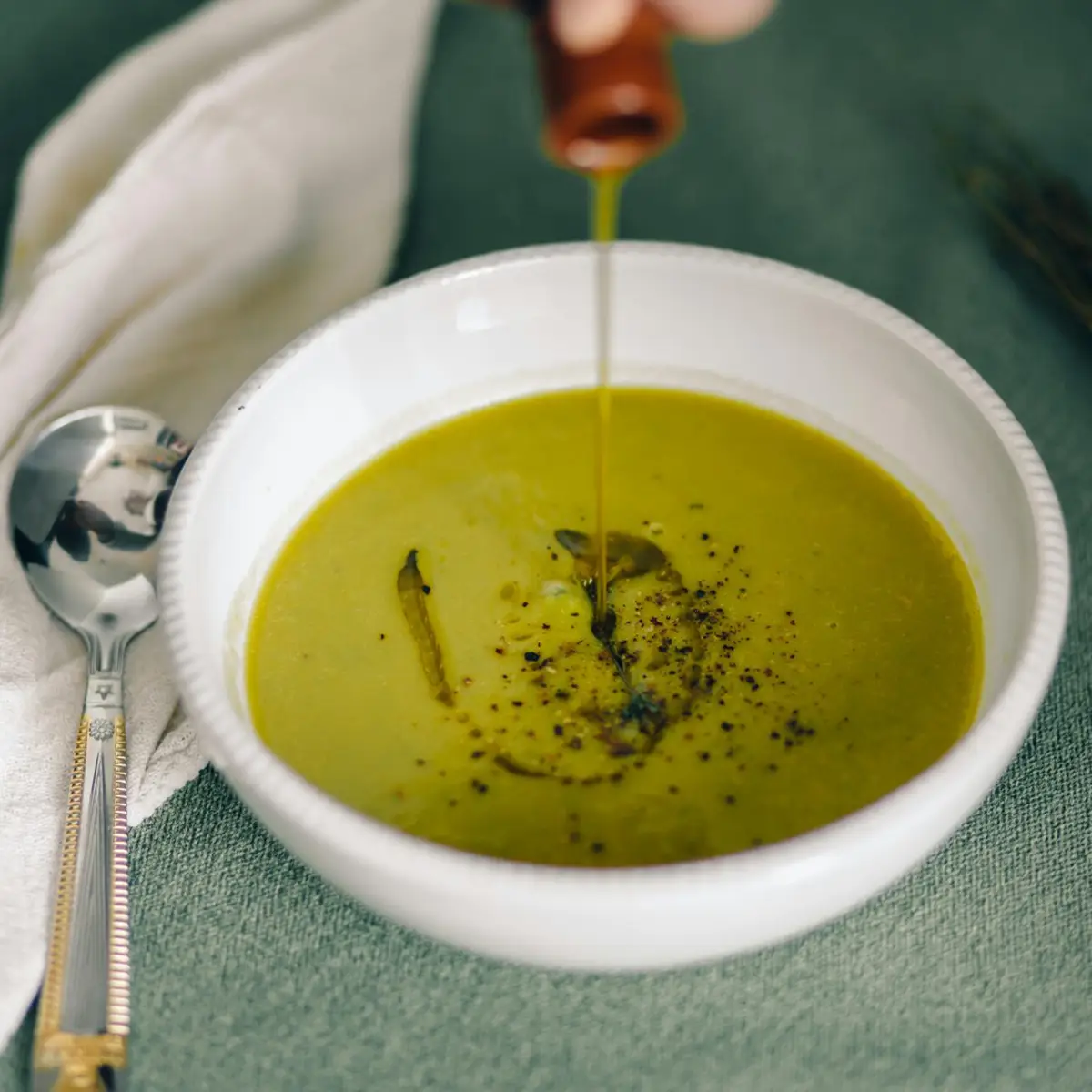 spinazie slinken. Zet het vuur uit en voeg de halve avocado, de peterselie en de munt toe. Neem de pan van het vuur, giet er nog 5 dl gekookt water bij en meng alles door elkaar met de staafmixer.